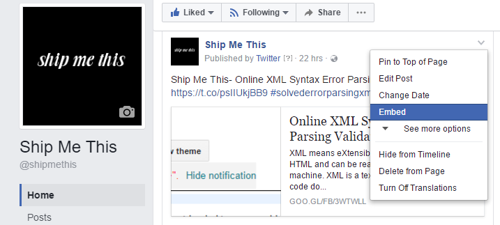 Provide theURL of post which you want to Embed that you have copied earlier.Select Get Code and you will get HTML code like the one below;<div class=”fb-post” data-href=”https://www.facebook.com/shipmethis/posts/1348810268487645″ data-width=”500″ data-show-text=”true”><blockquote cite=”https://www.facebook.com/shipmethis/posts/1348810268487645″ class=”fb-xfbml-parse-ignore”><p>Ship Me This- Online XML Syntax Error Parsing Validator Tool https://t.co/psIIUkjBB9 #solvederrorparsingxml</p>Posted by <a href=”https://www.facebook.com/shipmethis/”>Ship Me This</a> on <a href=”https://www.facebook.com/shipmethis/posts/1348810268487645″>Wednesday, April 26, 2017</a></blockquote></div>