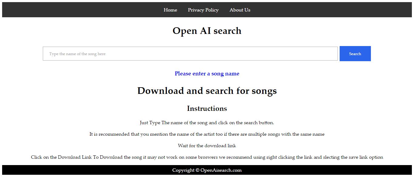 Openaisearch is a new search engine that provide direct download links to the songs. The playback file comes in.m4a format. It is pretty easy to search and download songs from this innovative search engine. It was created using php python and some open ai codes such as openai which is available on github.