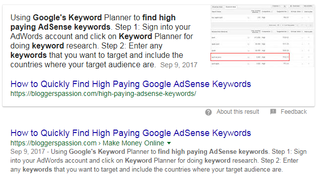 I was searching for High paying Google Adsense keywords and the search page provided this result. This snippet shows information from the first result in Google.